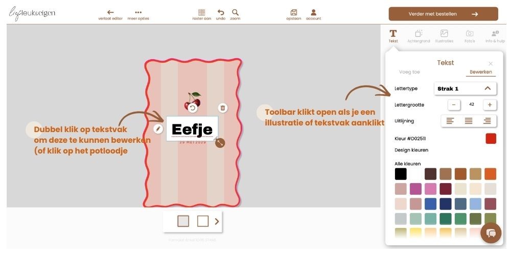 Je hebt het kaartje gevonden en nu wil je deze graag helemaal aanpassen naar jouw wens. Dat kan. In onze online ontwerptool kan je teksten, achtergronden, illustraties aanpassen en toevoegen. Ook kan je eigen foto’s toevoegen. We leggen hier graag uit hoe je de editor kan gebruiken en waar alle functies voor bedoeld.