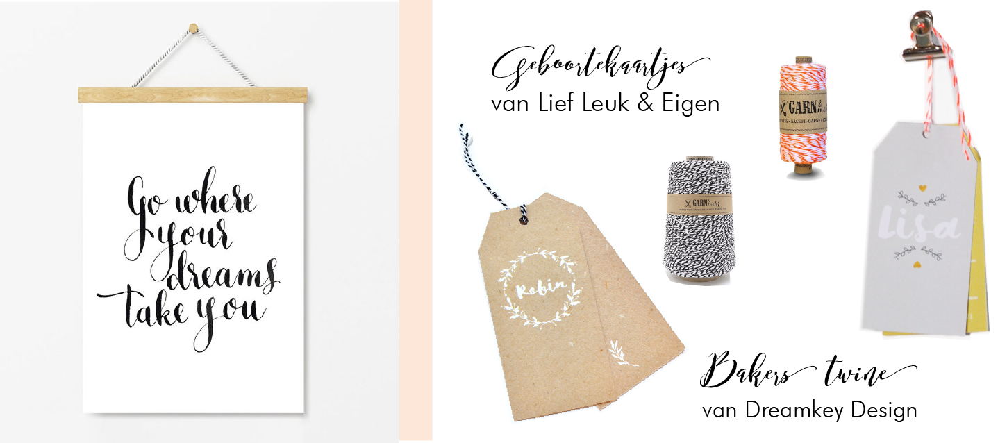 En waar we ook blij van worden, zijn alle soorten gekleurd touw ofwel bakers twine. Dreamkey Design heeft dit in allemaal fijne kleurtjes - ook koper- en goudkleurig! Een uitkomst voor het sierlijk vastbinden van labeltjes en tags bij geboortekaartjes of kraambedankjes