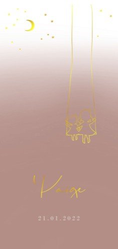 Lief en stoer, dit geboortekaartje voor een zusje, met maan en sterren. Nu ook in het 10x21 formaat! Het simpele design komt prachtig naar voren door de goudfolie. Dit kaartje is DIY wat inhoudt dat je deze helemaal naar eigen wens kan aanpassen. Ook kan je de kleur folie aanpassen (zilver, koper of rosegoud) of zelfs weglaten.